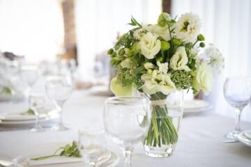 Для гостевых столов мы приготовили мартинки (это такие красивые вазы на длинных ножках) с композициями из роз и зелени эвкалипта, а через весь стол протянули напероны персикового цвета.