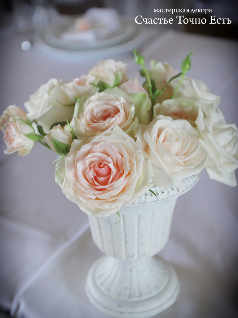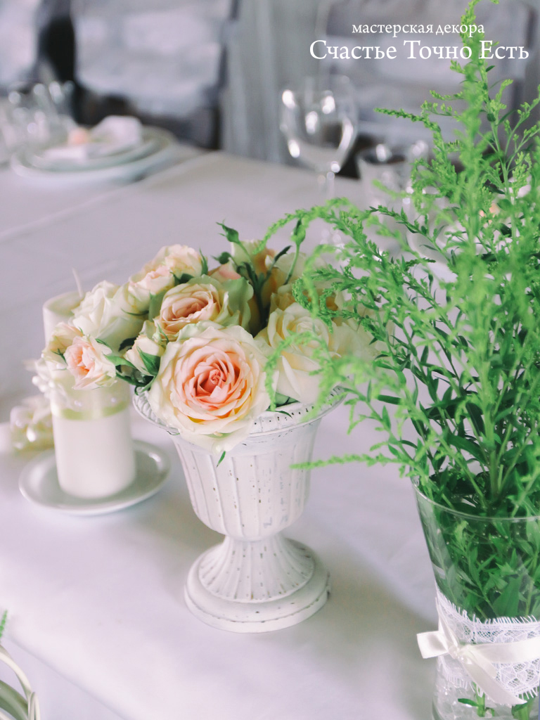 Уютный ресторан и оформление в стиле прованс придали свадьбе Миши и Оли незабываемую атмосферу. Интерьер ресторана был в темных тонах, и мы предложили использовать в оформлении только светлые ткани, много зелени и цветы пастельных оттенков . Мы сами изготовили аксессуары, которые выполнили в стиле шебби шик — чемодан, часы и вазы. Эти элементы и стали изюминкой свадебного оформления.